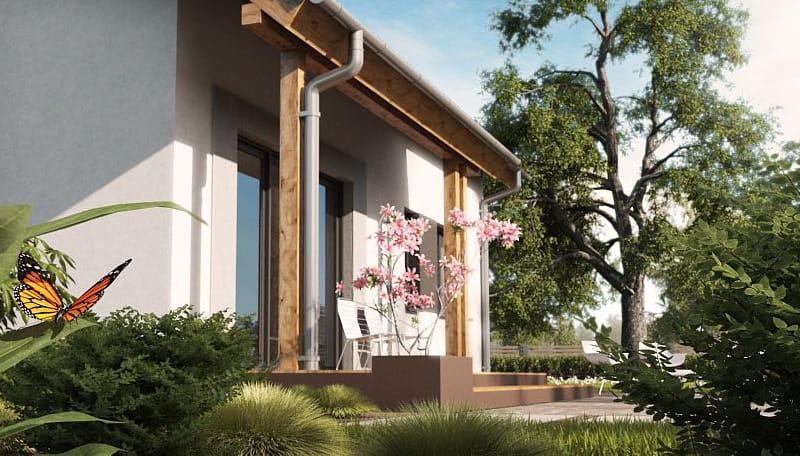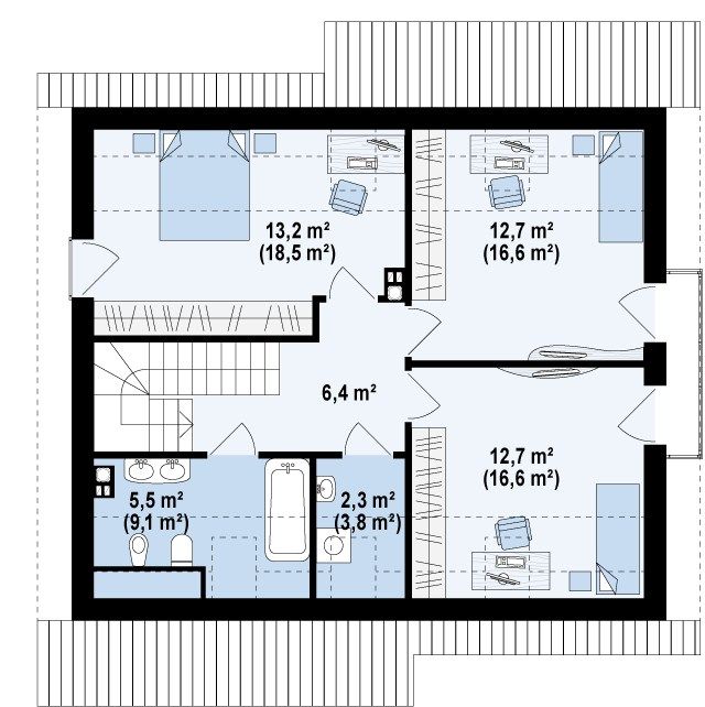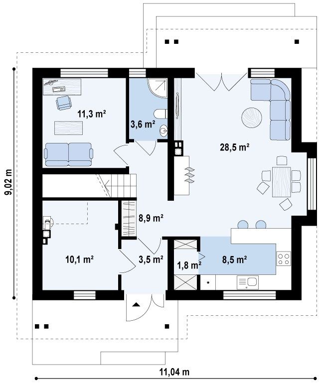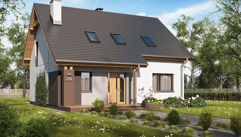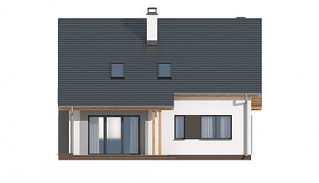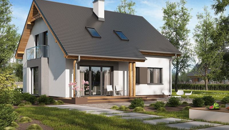 Проект двухэтажного пятикомнатного газобетонного жилого дома 9,02 м х 11,04 м в современном стиле общей площадью 147 кв.м с мансардным этажом, с террасой, c четырьмя спальнями, с двумя санузлами, с камином.