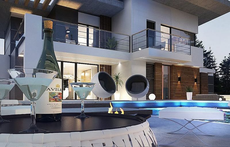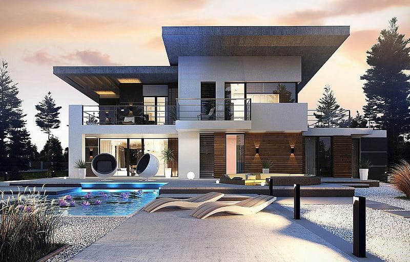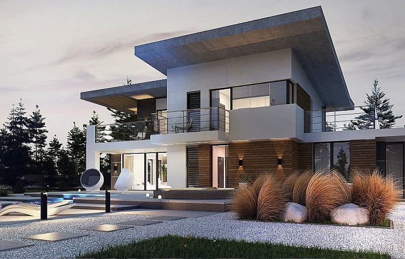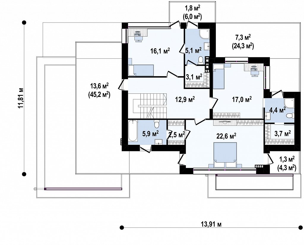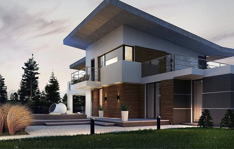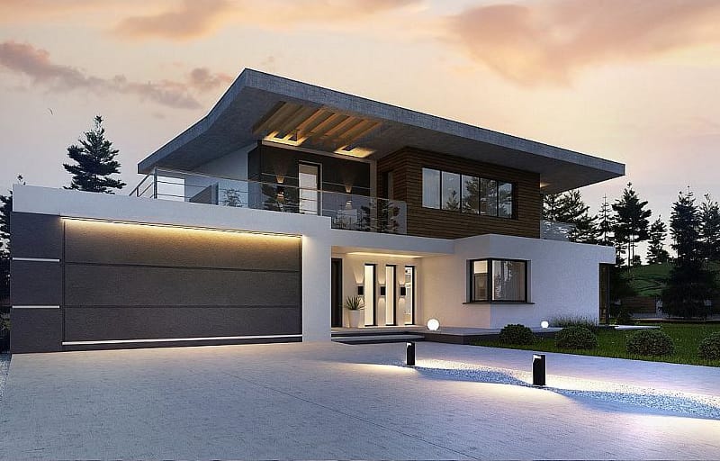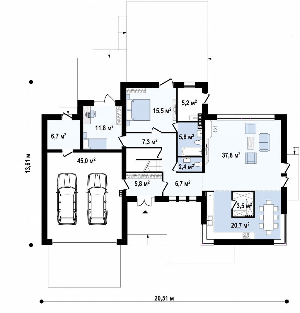 Проект двухэтажного шестикомнатного газобетонного жилого дома 13,61 м х 20,51 м в современном стиле общей площадью 477 кв.м с подвальным этажом, с гаражом для двух автомобилей, с террасой, с пятью спальнями, с пятью санузлами, с камином.