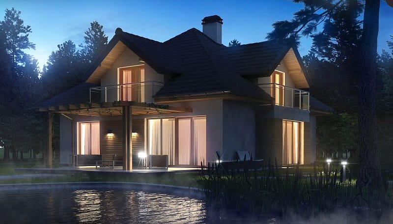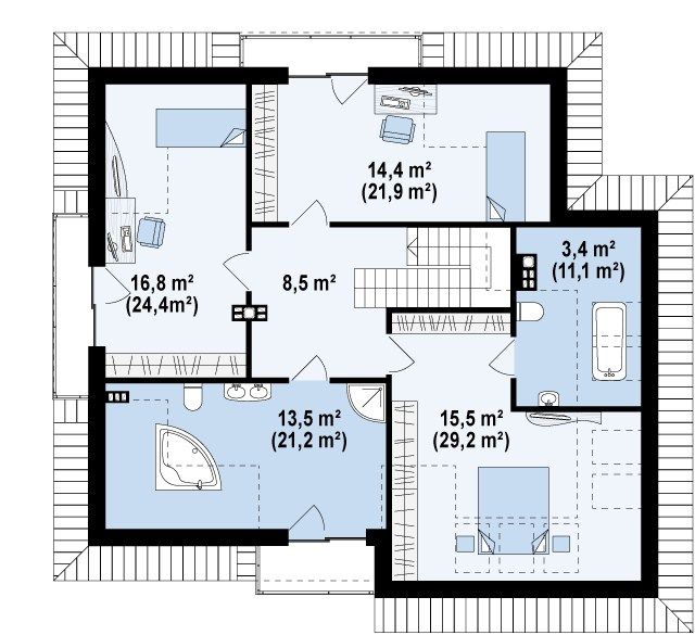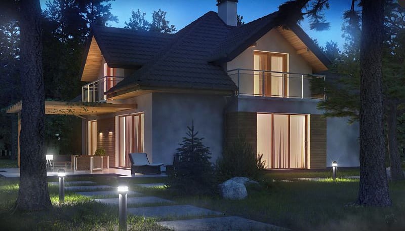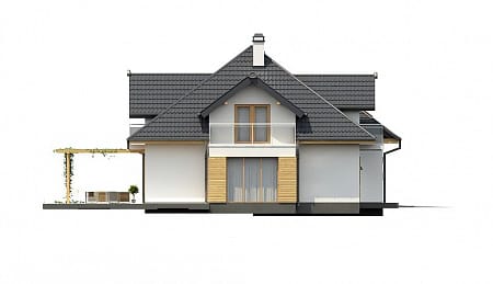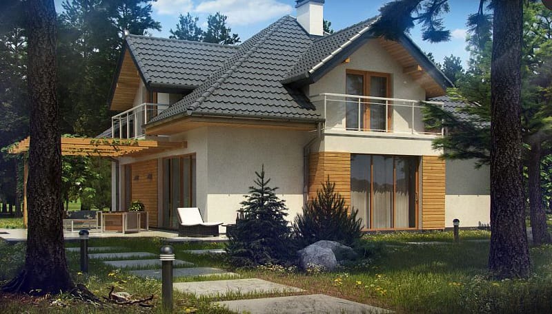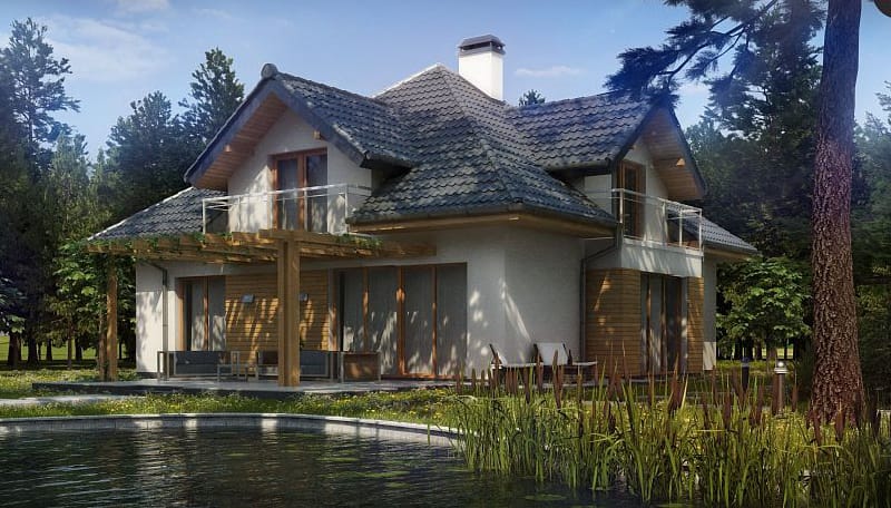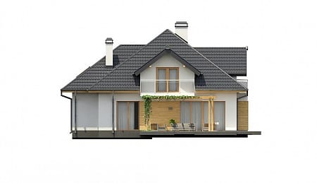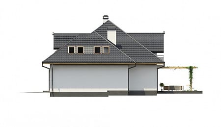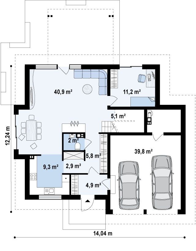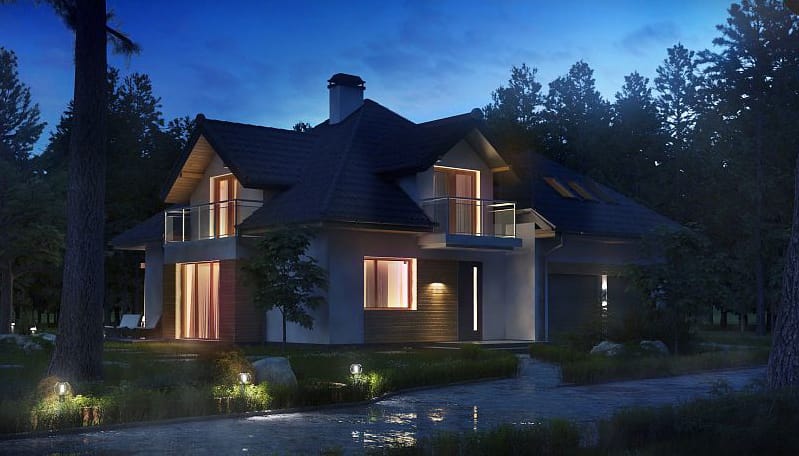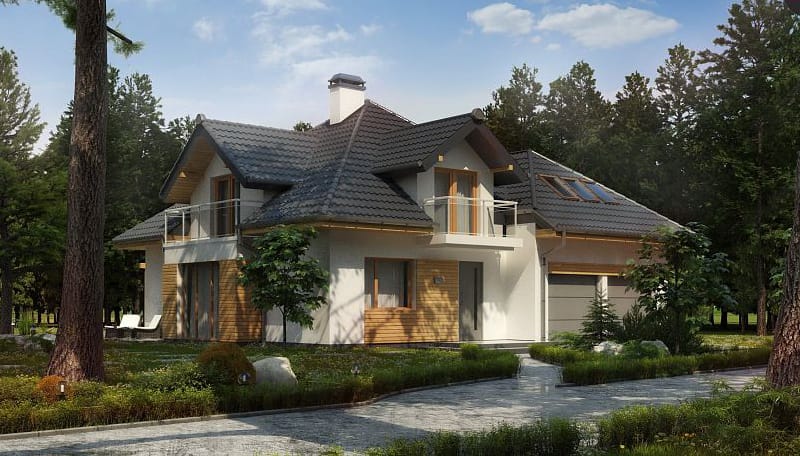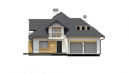 Проект двухэтажного пятикомнатного газобетонного жилого дома 12,24 м х 14,04 м в современном стиле общей площадью 239 кв.м с мансардным этажом, с гаражом для двух автомобилей, с террасой, c четырьмя спальнями, с двумя санузлами, с камином.