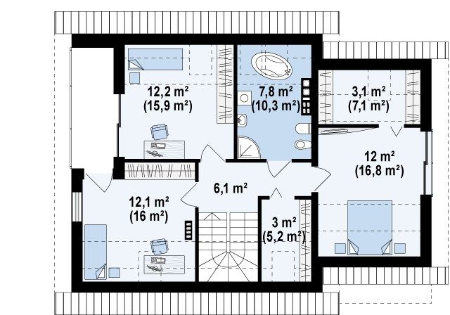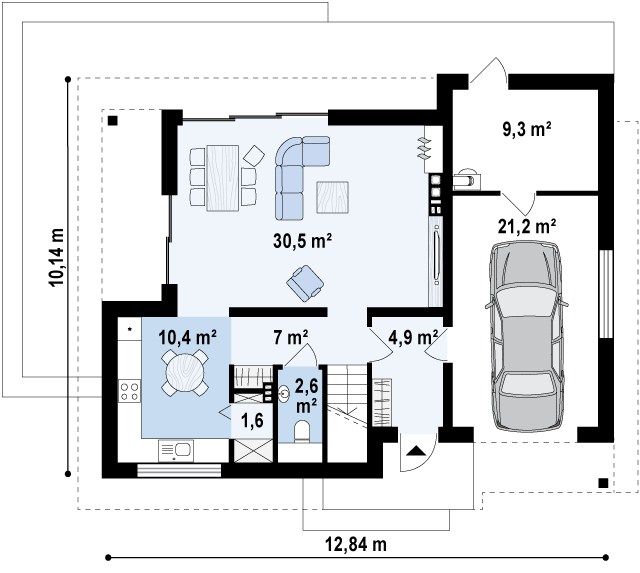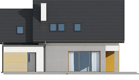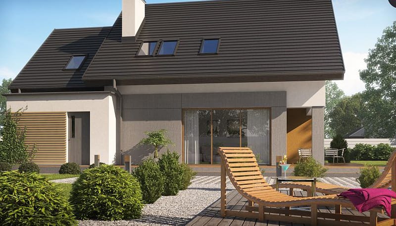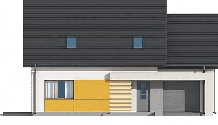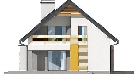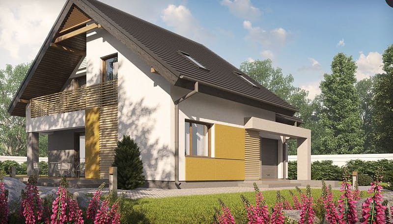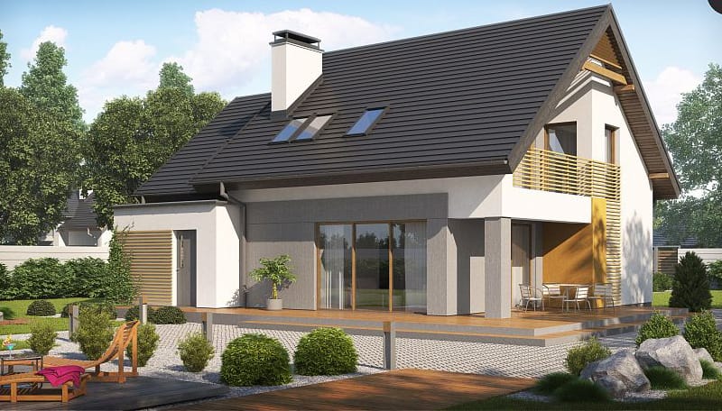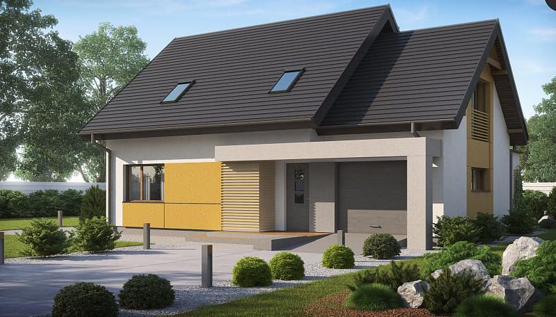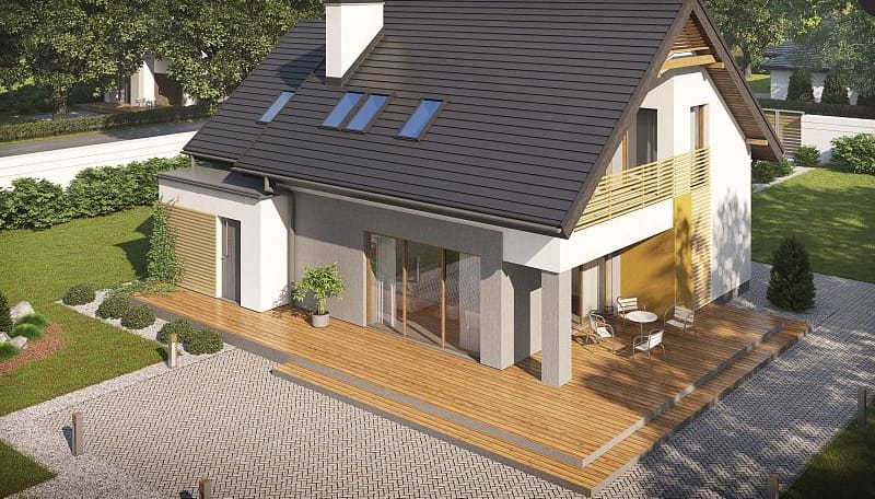 Проект двухэтажного четырехкомнатного газобетонного жилого дома 10,14 м х 12,84 м в современном стиле общей площадью 165 кв.м с мансардным этажом, с гаражом для одного автомобиля, с террасой, с тремя спальнями, с двумя санузлами, с камином.