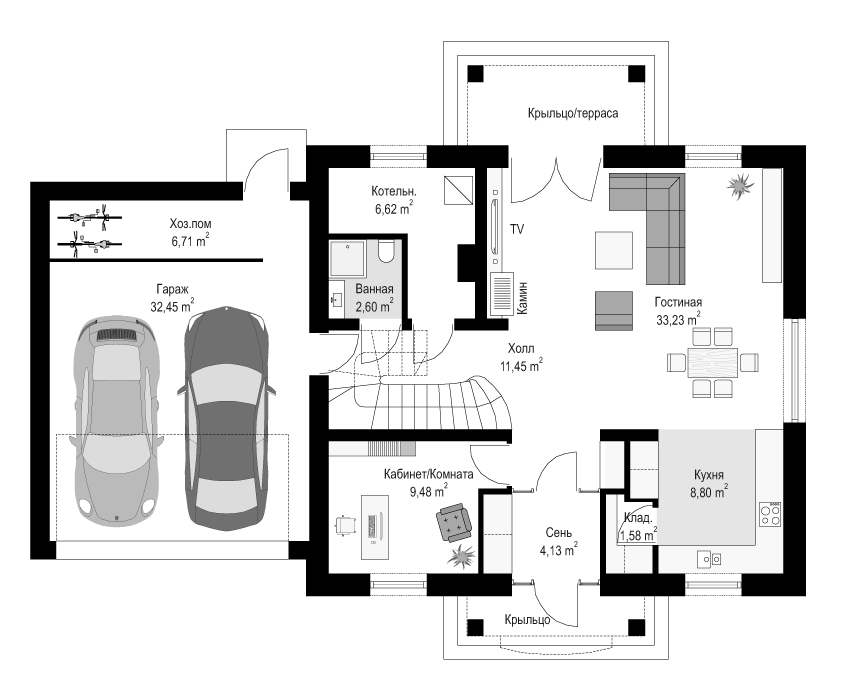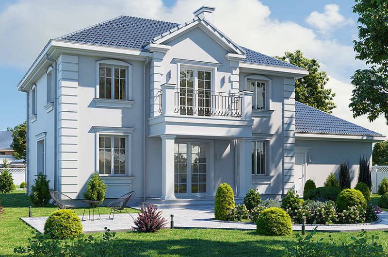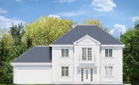 Проект двухэтажного шестикомнатного каркасного жилого дома 10,99 м х 16,41 м в классическом стиле общей площадью 249 кв.м с гаражом для двух автомобилей, с террасой, с пятью спальнями, с тремя санузлами, с камином.