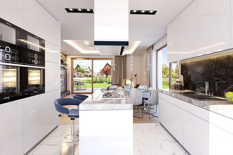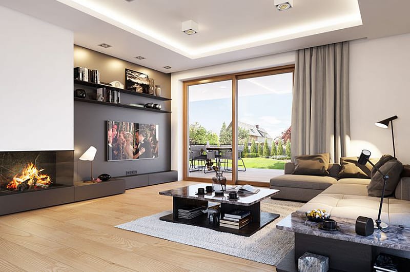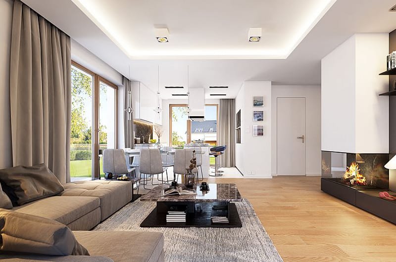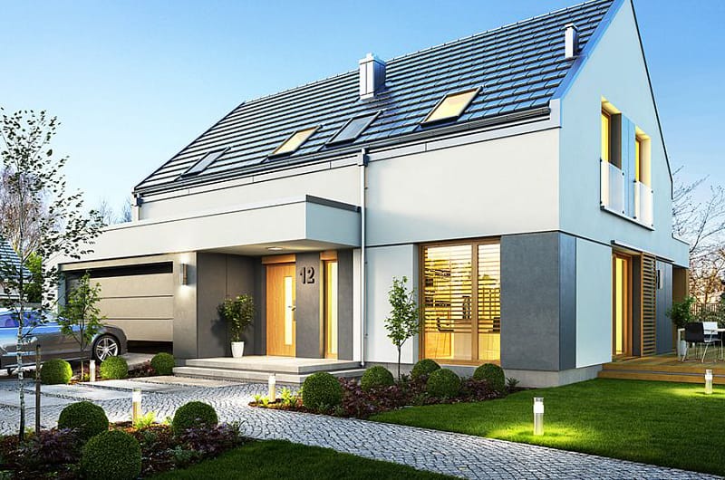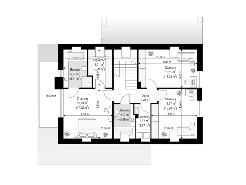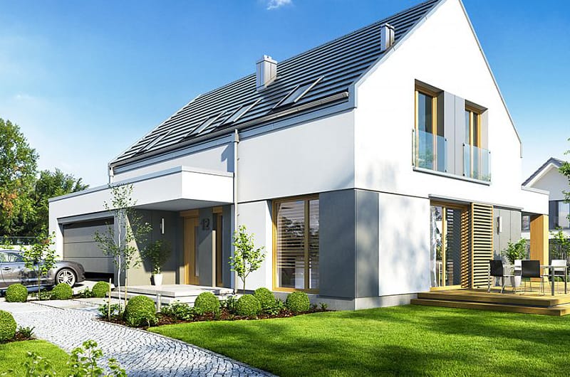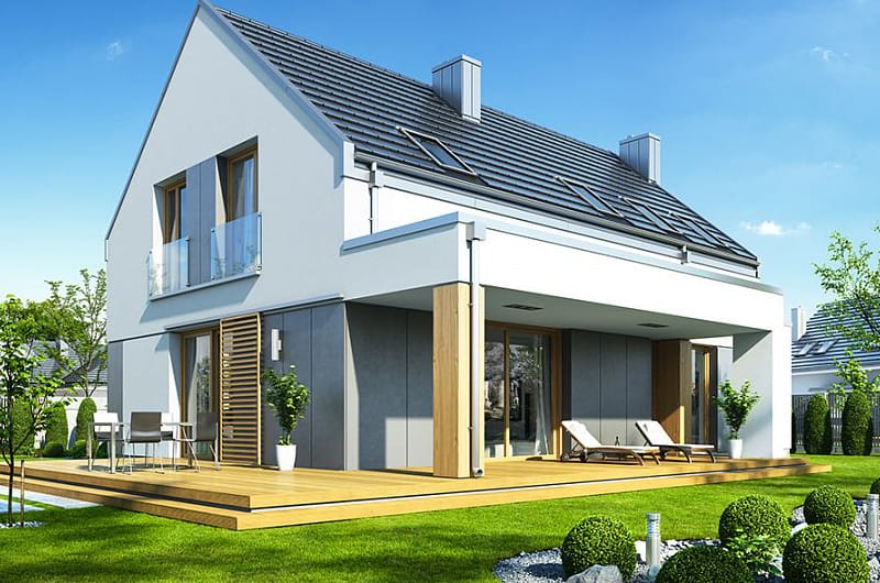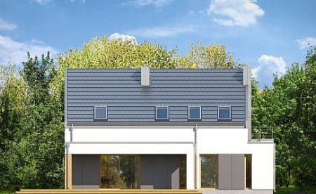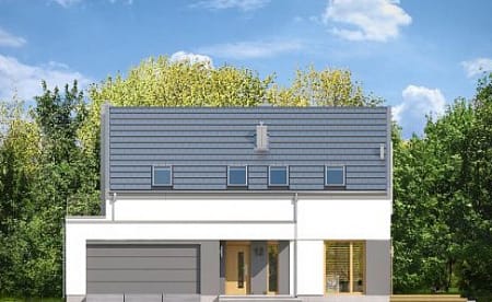 Проект двухэтажного пятикомнатного каркасного жилого дома 10,29 м х 14,14 м в современном стиле общей площадью 204 кв.м с мансардным этажом, с гаражом для двух автомобилей, с террасой, c четырьмя спальнями, с тремя санузлами, с камином.