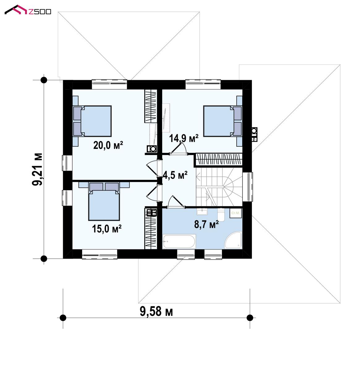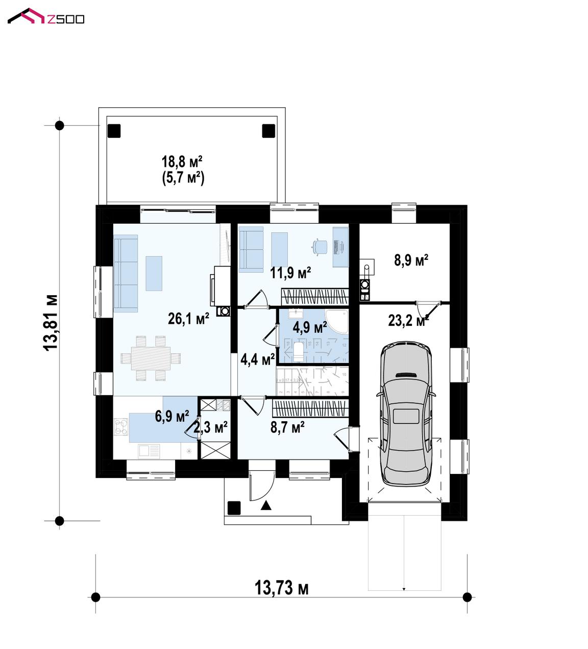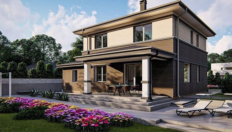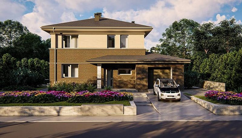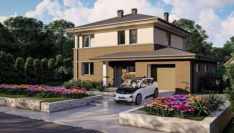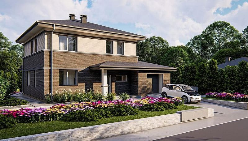 Проект двухэтажного пятикомнатного каркасного жилого дома 13,81 м х 13,73 м в современном стиле общей площадью 160 кв.м с гаражом для одного автомобиля, с террасой, c четырьмя спальнями, с двумя санузлами, с камином.