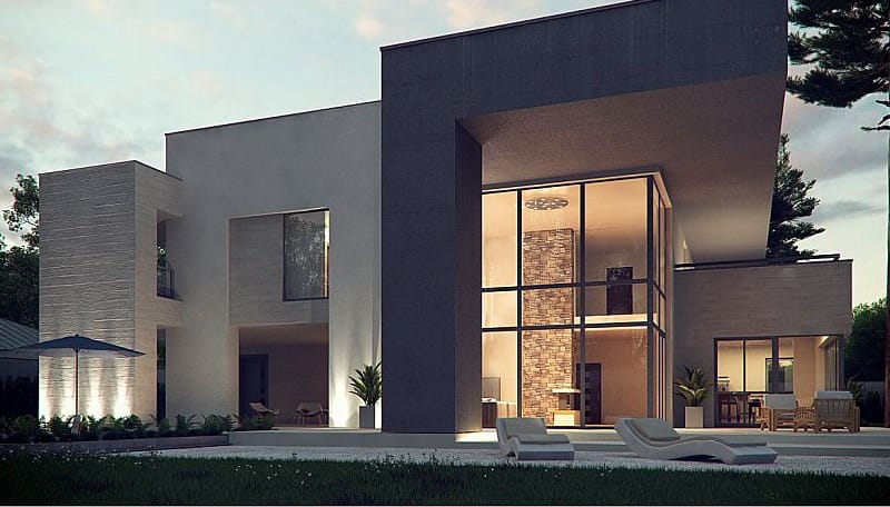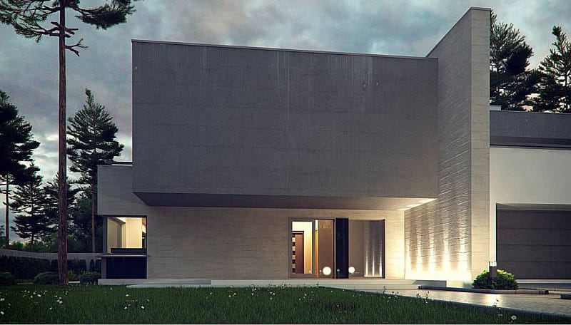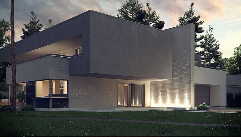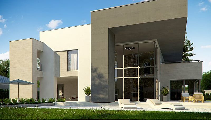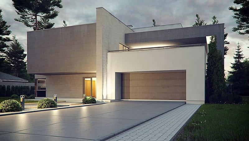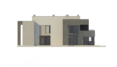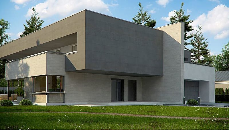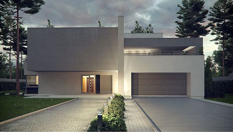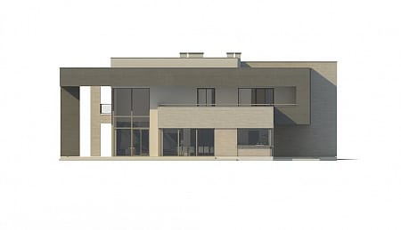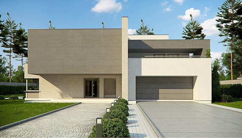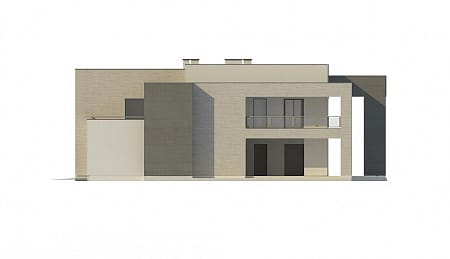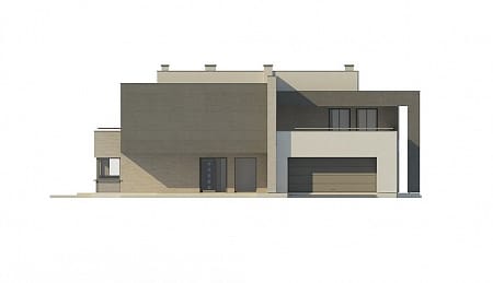 Проект двухэтажного пятикомнатного каркасного жилого дома 22,8 м х 20,4 м в стиле хай-тек общей площадью 312 кв.м с гаражом для двух автомобилей, с террасой, c четырьмя спальнями, с тремя санузлами, с камином, с сауной.
