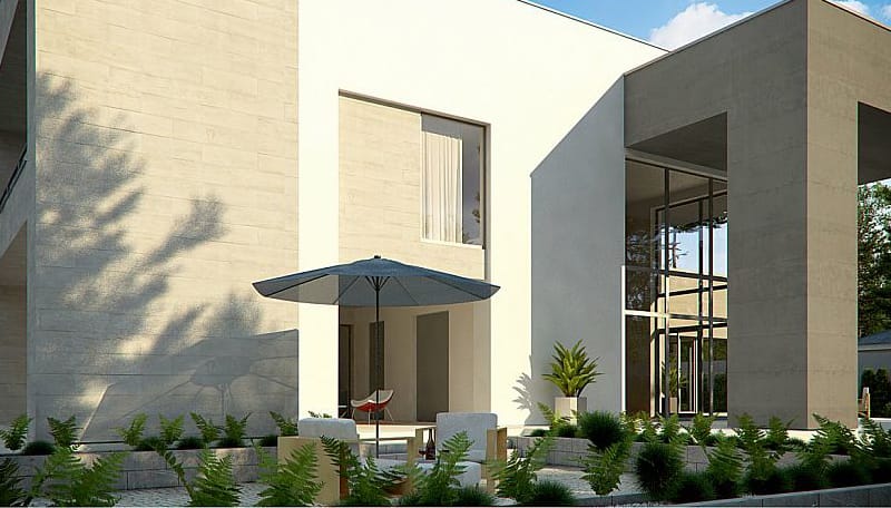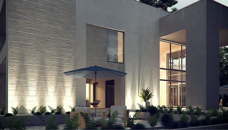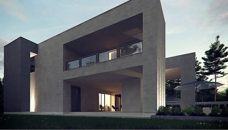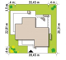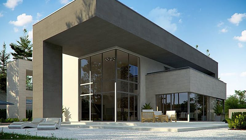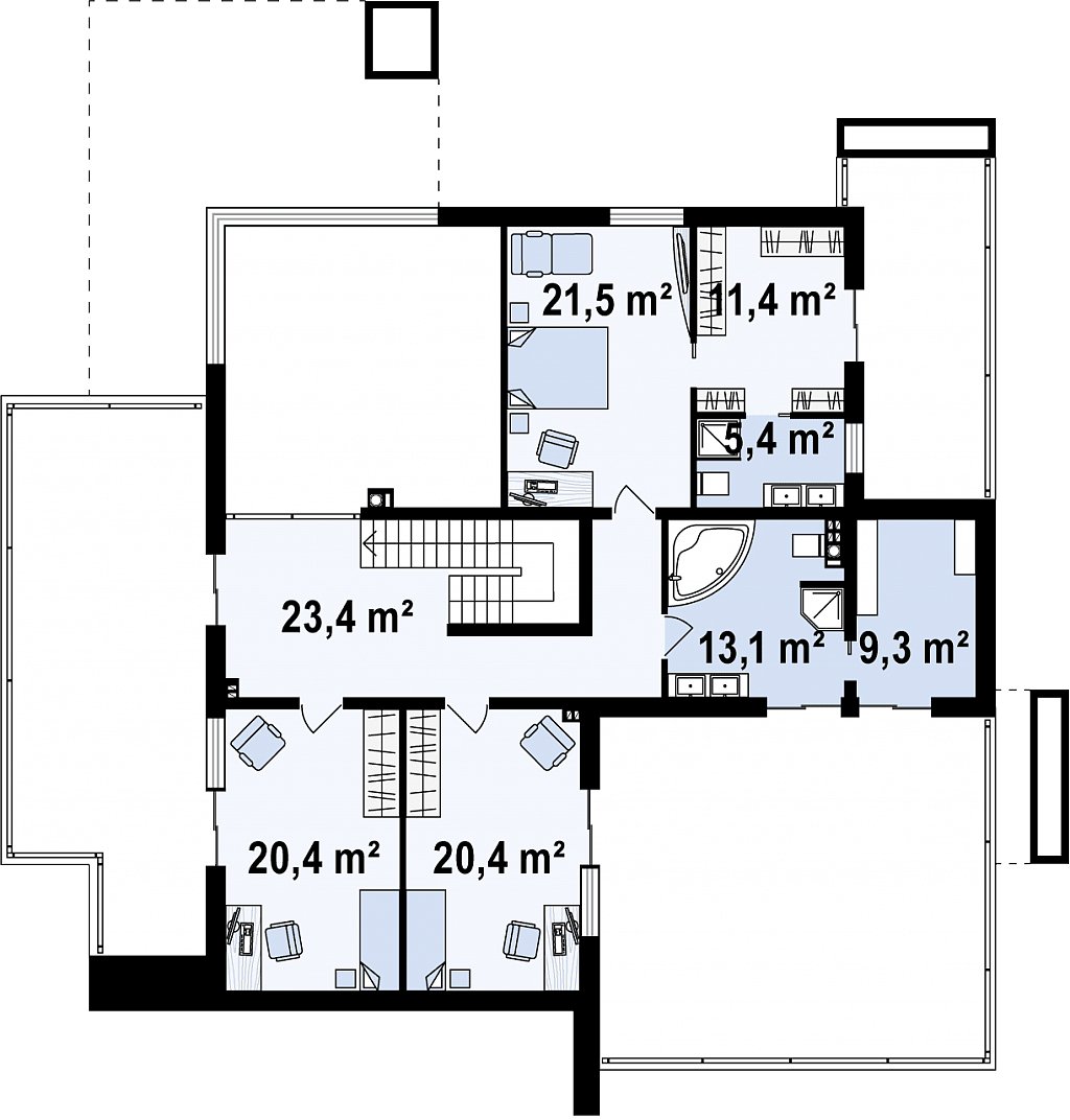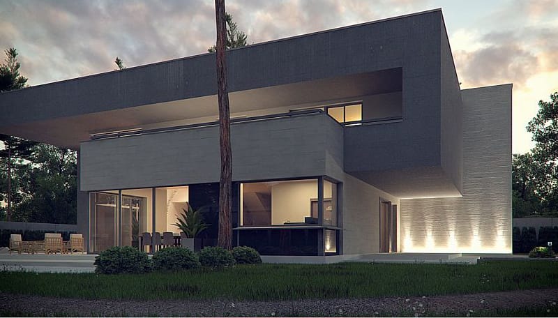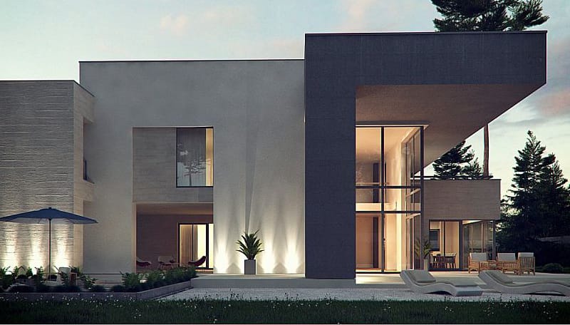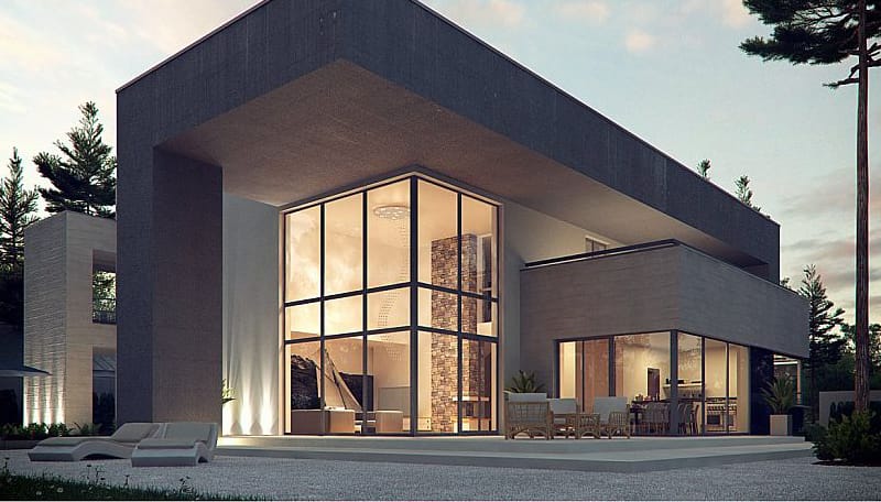 Проект двухэтажного пятикомнатного каркасного жилого дома 22,8 м х 20,4 м в стиле хай-тек общей площадью 312 кв.м с гаражом для двух автомобилей, с террасой, c четырьмя спальнями, с тремя санузлами, с камином, с сауной.