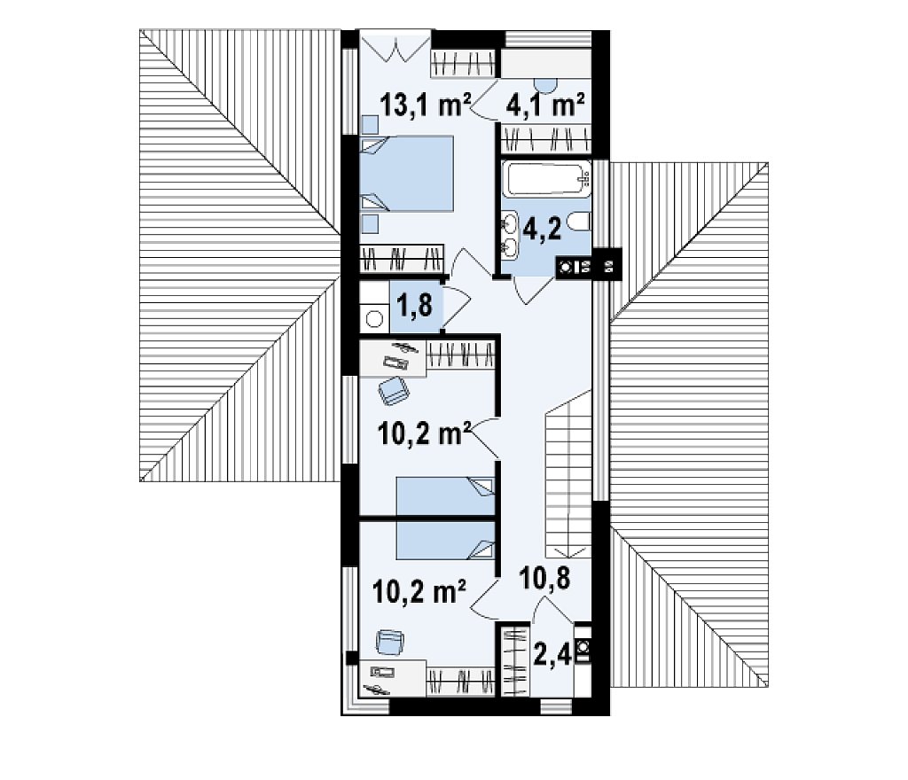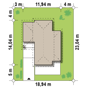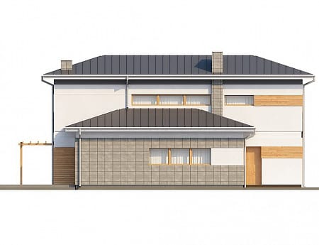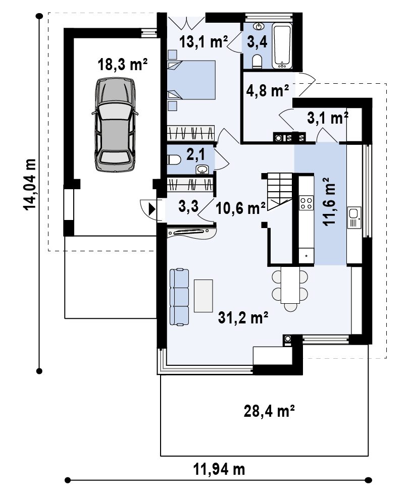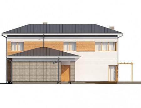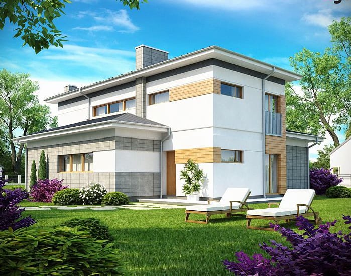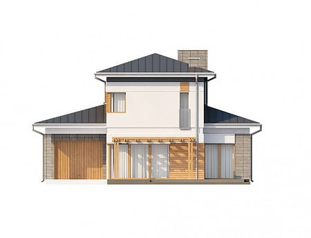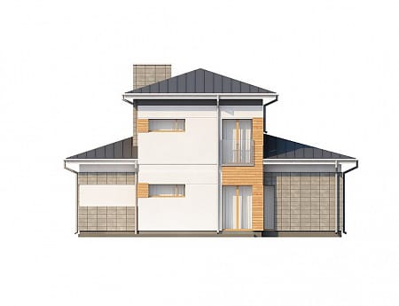 Проект двухэтажного пятикомнатного каркасного жилого дома 14,04 м х 11,94 м в современном стиле общей площадью 158 кв.м с гаражом для одного автомобиля, с террасой, c четырьмя спальнями, с тремя санузлами, с камином.