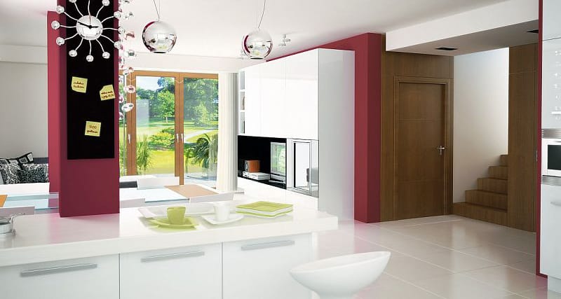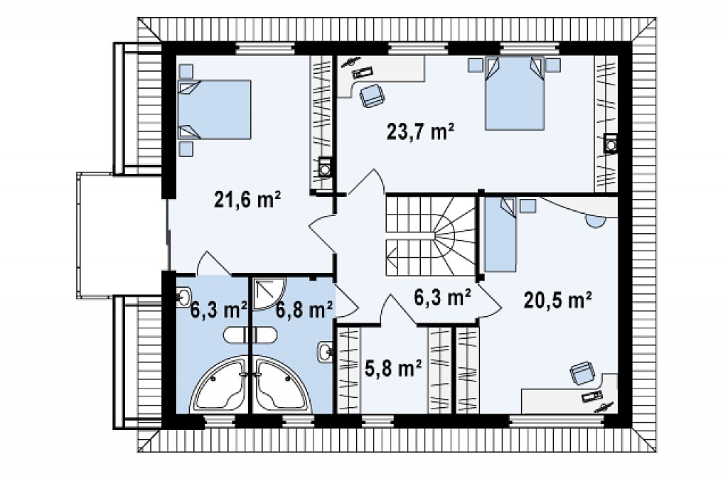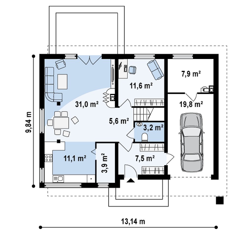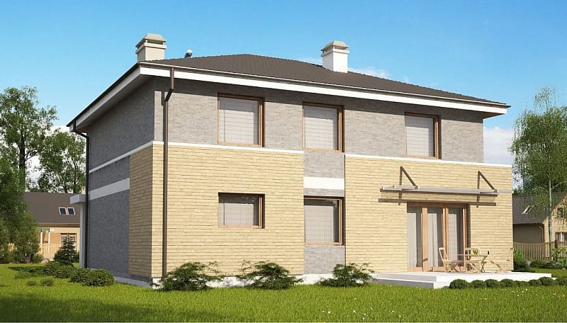 Проект двухэтажного пятикомнатного каркасного жилого дома 9,8 м х 13,1 м в современном стиле общей площадью 199 кв.м с гаражом для одного автомобиля, с террасой, c четырьмя спальнями, с тремя санузлами, с камином.