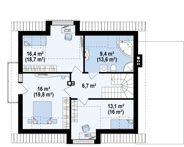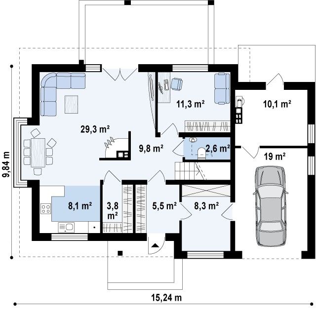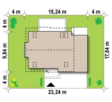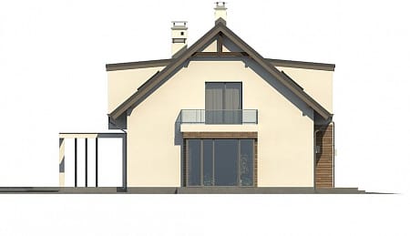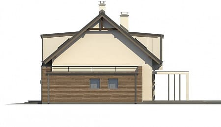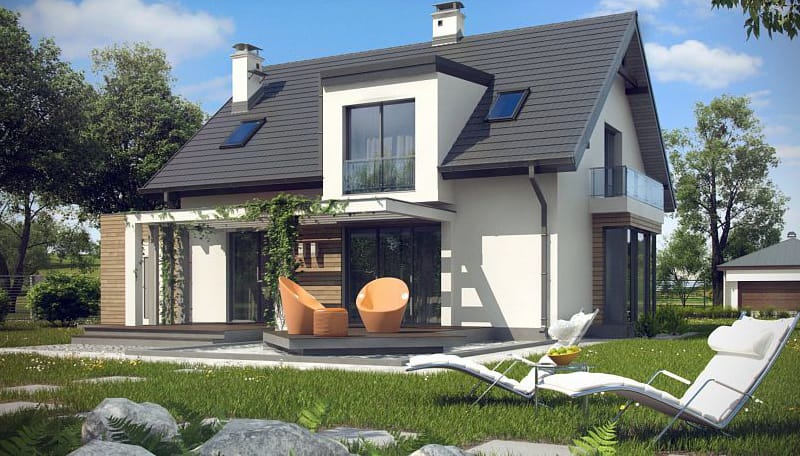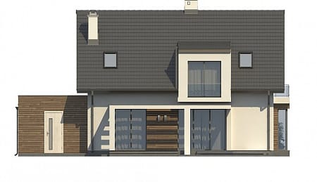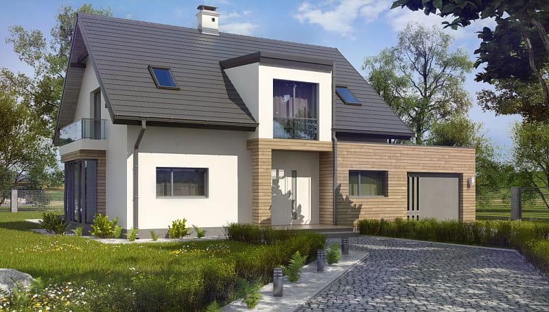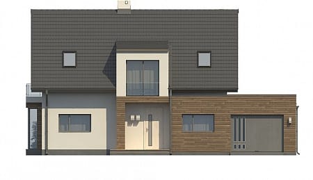Проект двухэтажного пятикомнатного каркасного жилого дома 9,84 м х 15,24 м в современном стиле общей площадью 183 кв.м с мансардным этажом, с гаражом для одного автомобиля, с террасой, c четырьмя спальнями, с двумя санузлами, с камином.