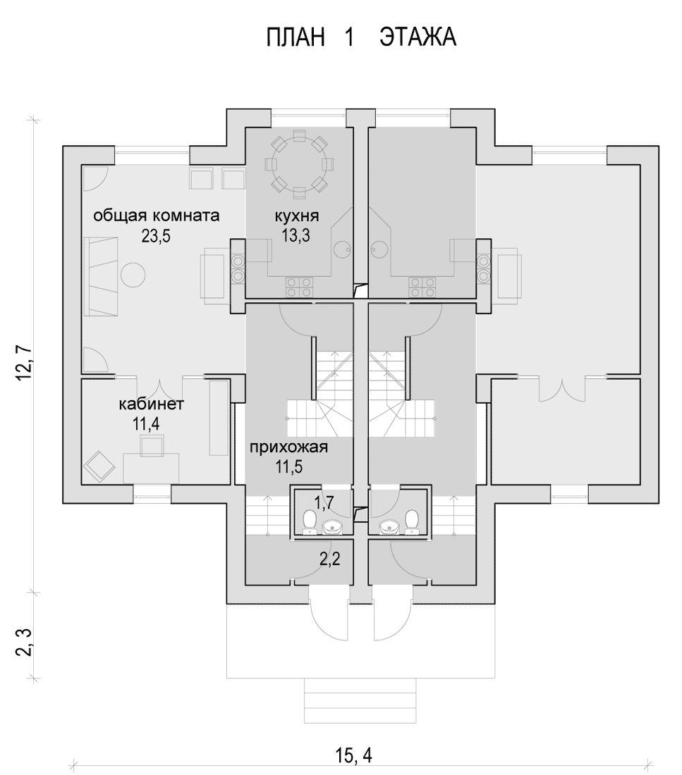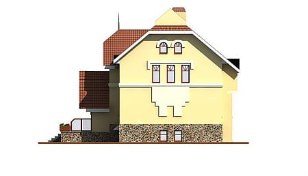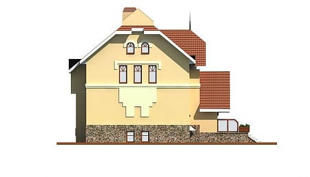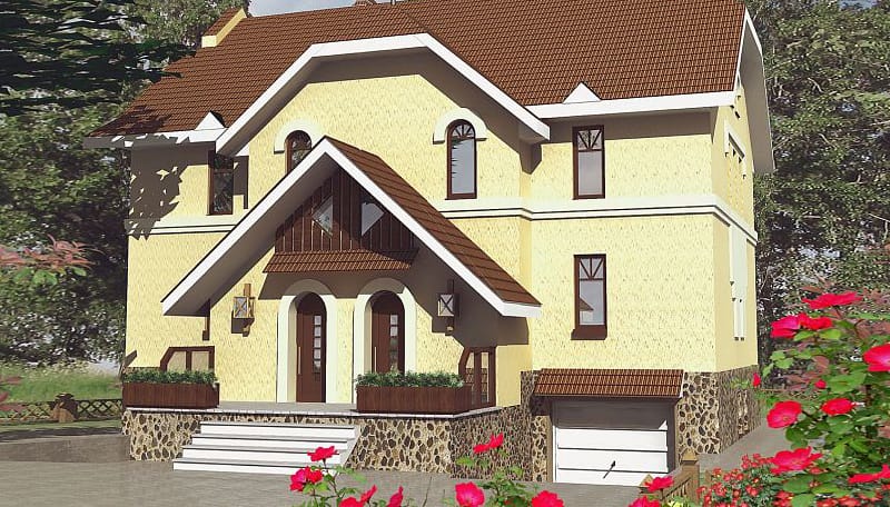 Проект двухэтажного четырехкомнатного каркасного жилого дома 15 м х 15,4 м в классическом стиле общей площадью 187 кв.м с подвальным этажом, с гаражом для одного автомобиля, с террасой, с тремя спальнями, с четырьмя санузлами, с камином.