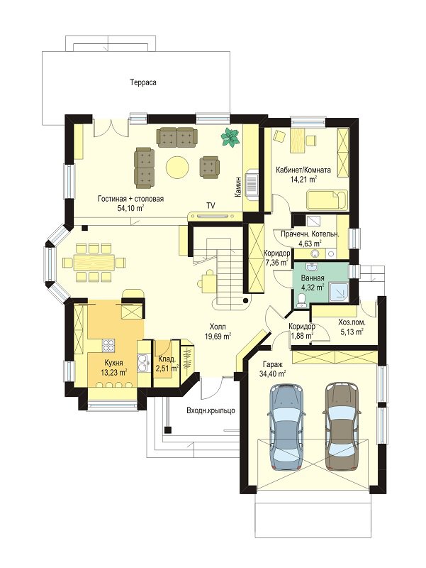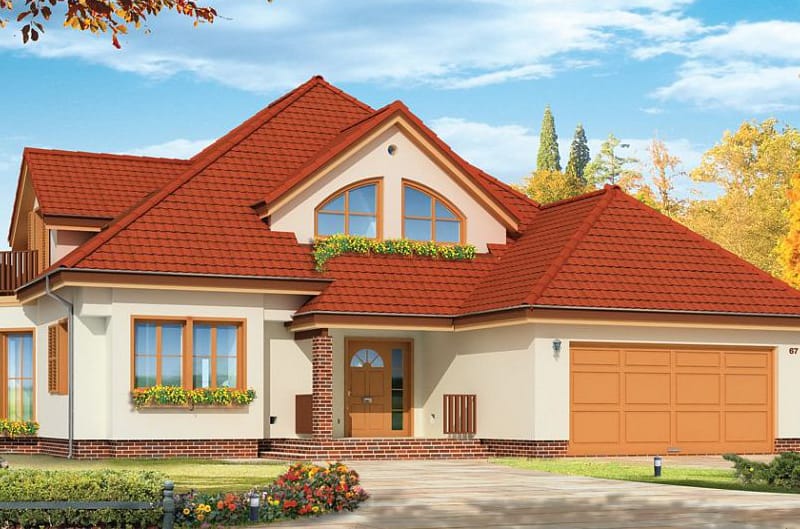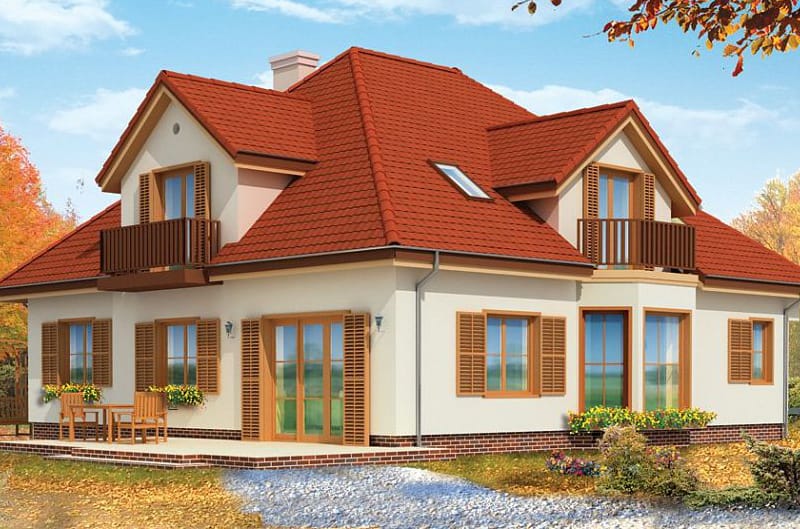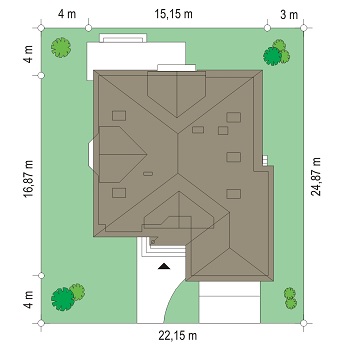 Проект двухэтажного шестикомнатного каркасного жилого дома 16,87 м х 15,15 м в классическом стиле общей площадью 303 кв.м с мансардным этажом, с гаражом для двух автомобилей, с террасой, с пятью спальнями, с тремя санузлами, с камином.