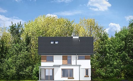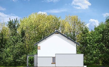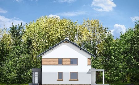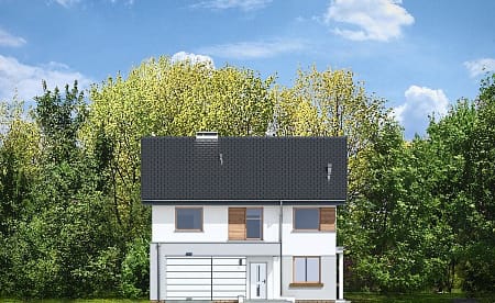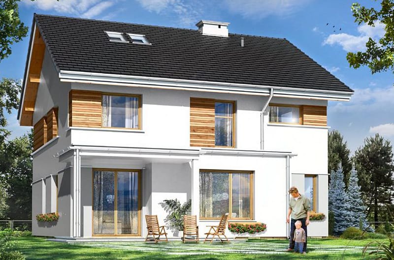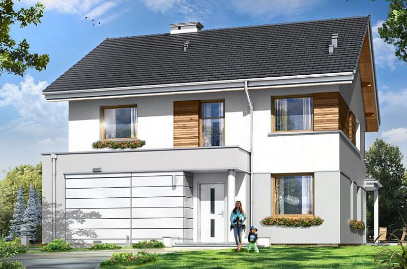 Проект двухэтажного четырехкомнатного каркасного жилого дома 13,76 м х 10,08 м в современном стиле общей площадью 205 кв.м с гаражом для одного автомобиля, с террасой, с тремя спальнями, с двумя санузлами, с камином.
