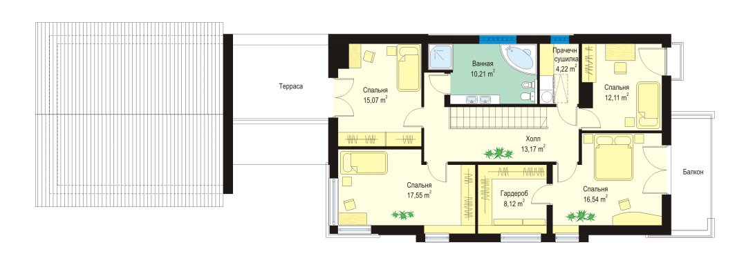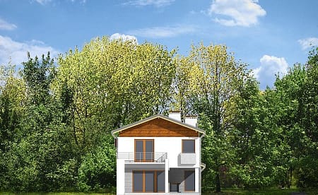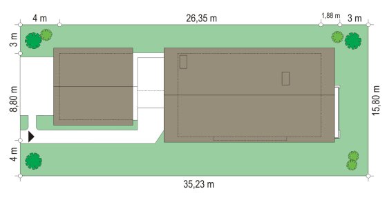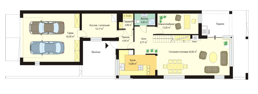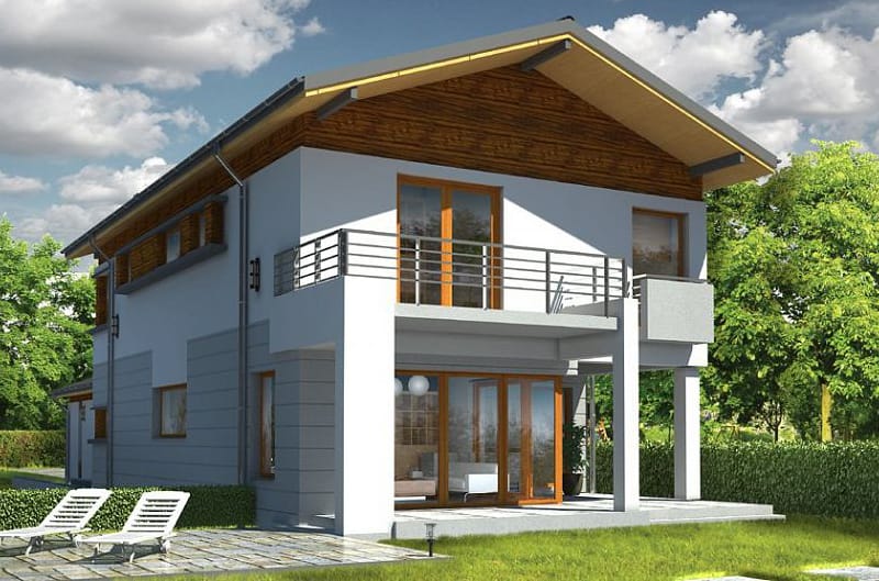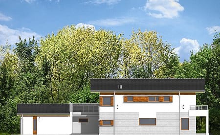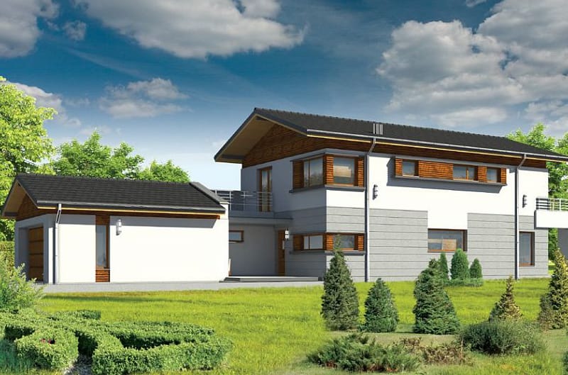 Проект двухэтажного шестикомнатного каркасного жилого дома 26,35 м х 8,8 м в современном стиле общей площадью 305 кв.м с гаражом для двух автомобилей, с террасой, с пятью спальнями, с двумя санузлами, с камином.