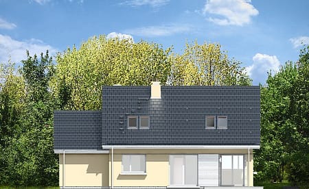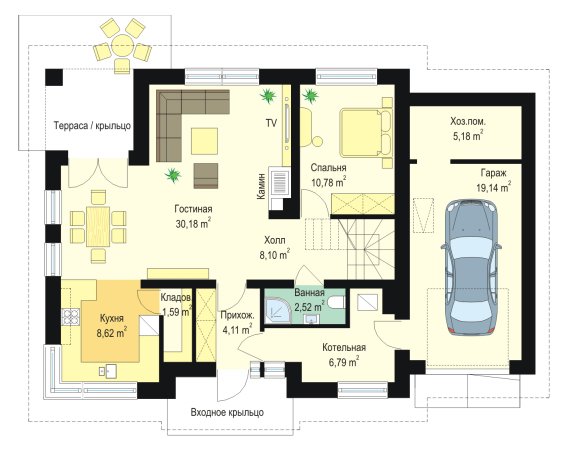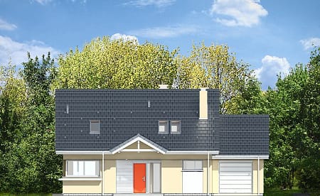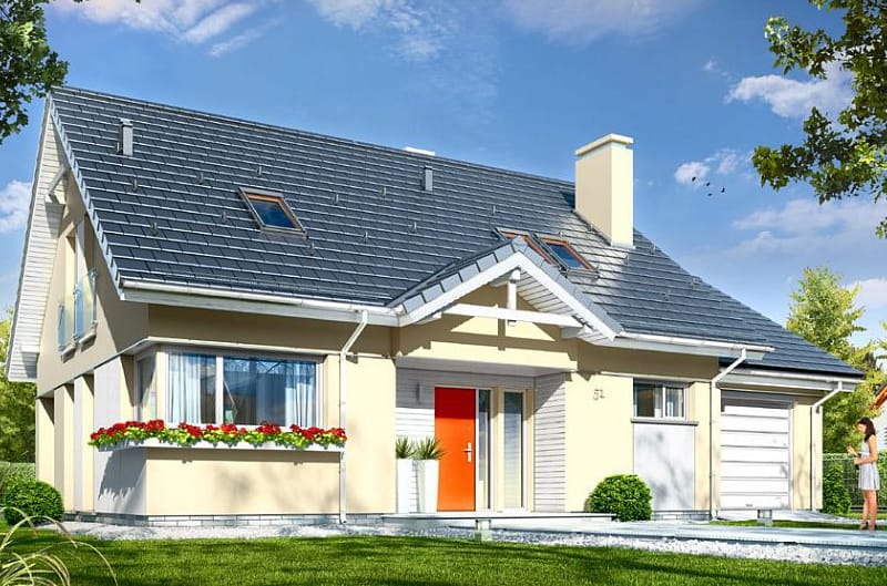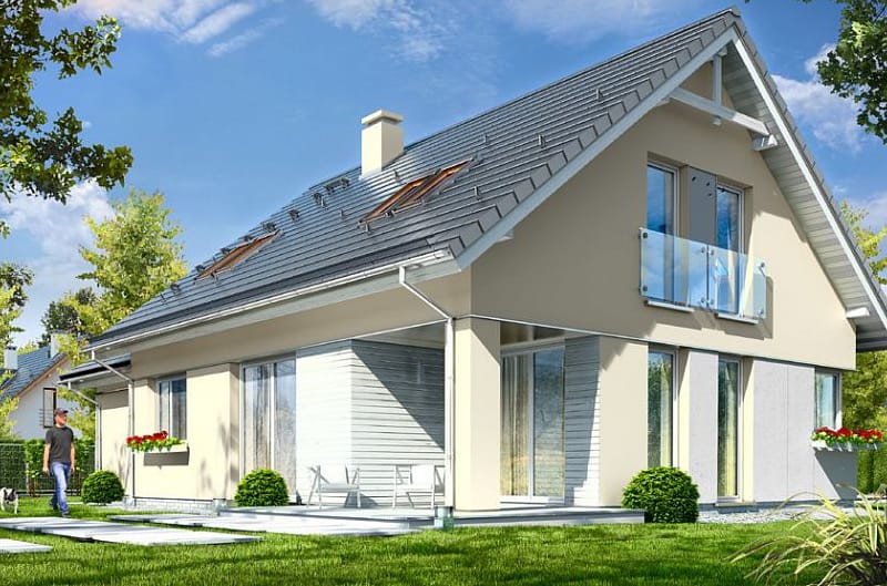 Проект двухэтажного пятикомнатного каркасного жилого дома 9,72 м х 14,49 м в современном стиле общей площадью 189 кв.м с мансардным этажом, с гаражом для одного автомобиля, с террасой, c четырьмя спальнями, с двумя санузлами, с камином.