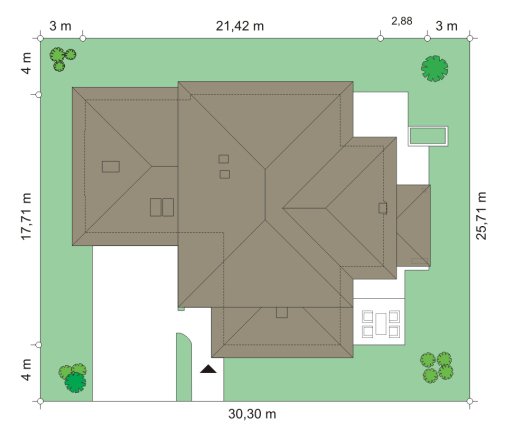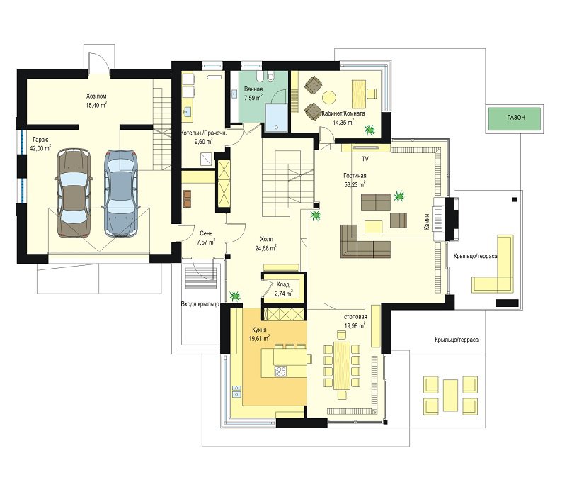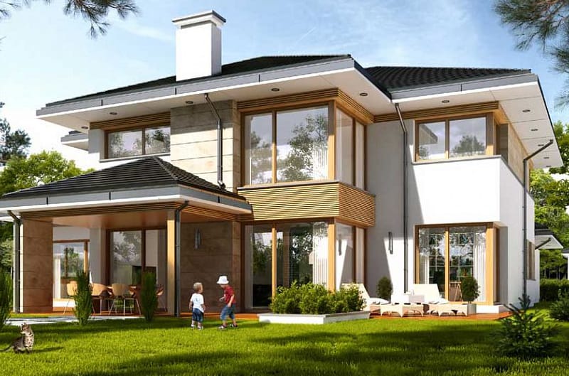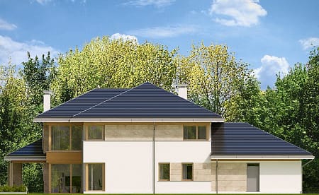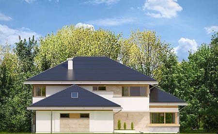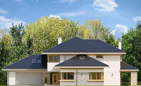 Проект двухэтажного пятикомнатного каркасного жилого дома 17,71 м х 24,3 м в современном стиле общей площадью 441 кв.м с гаражом для двух автомобилей, с террасой, c четырьмя спальнями, с тремя санузлами, с камином.
