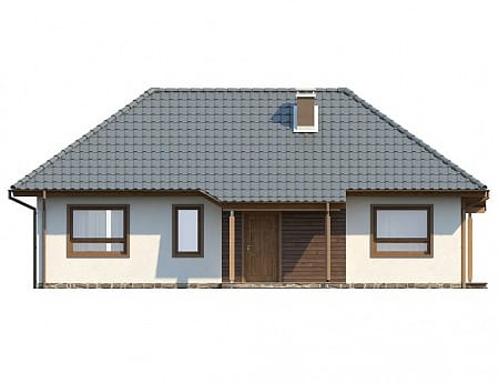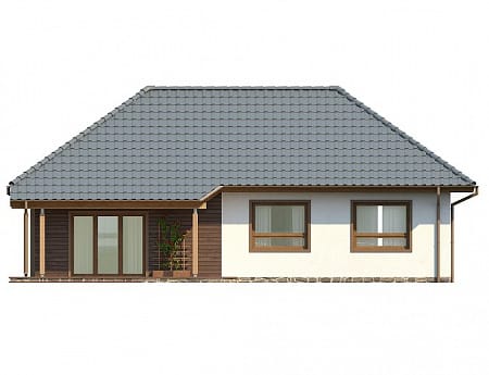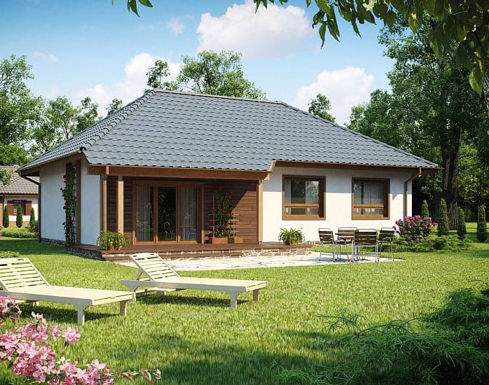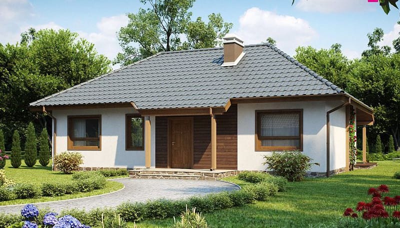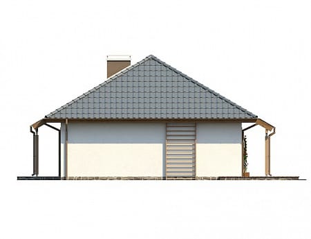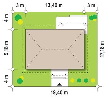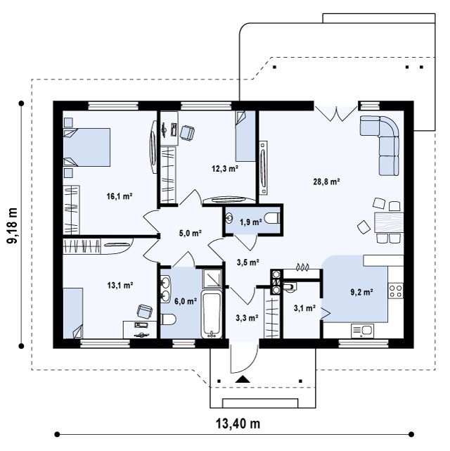 Проект одноэтажного четырехкомнатного газобетонного жилого дома 9,18 м х 13,40 м в современном стиле общей площадью 102 кв.м с террасой, с тремя спальнями, с двумя санузлами, с камином.