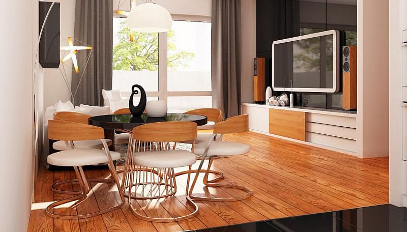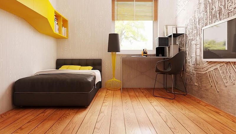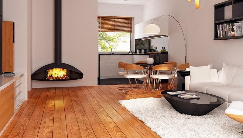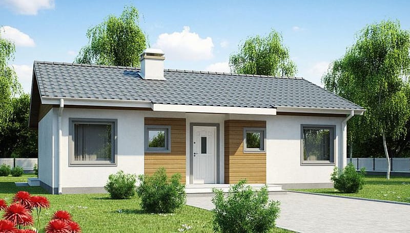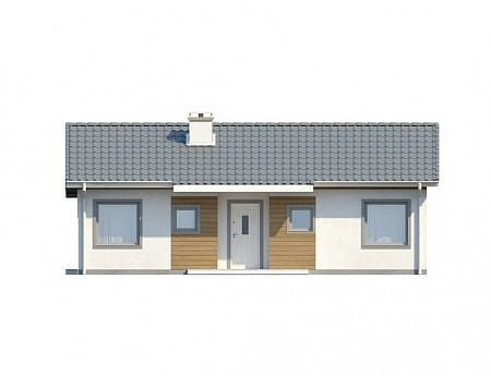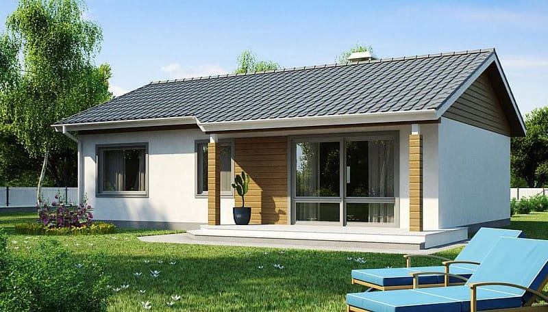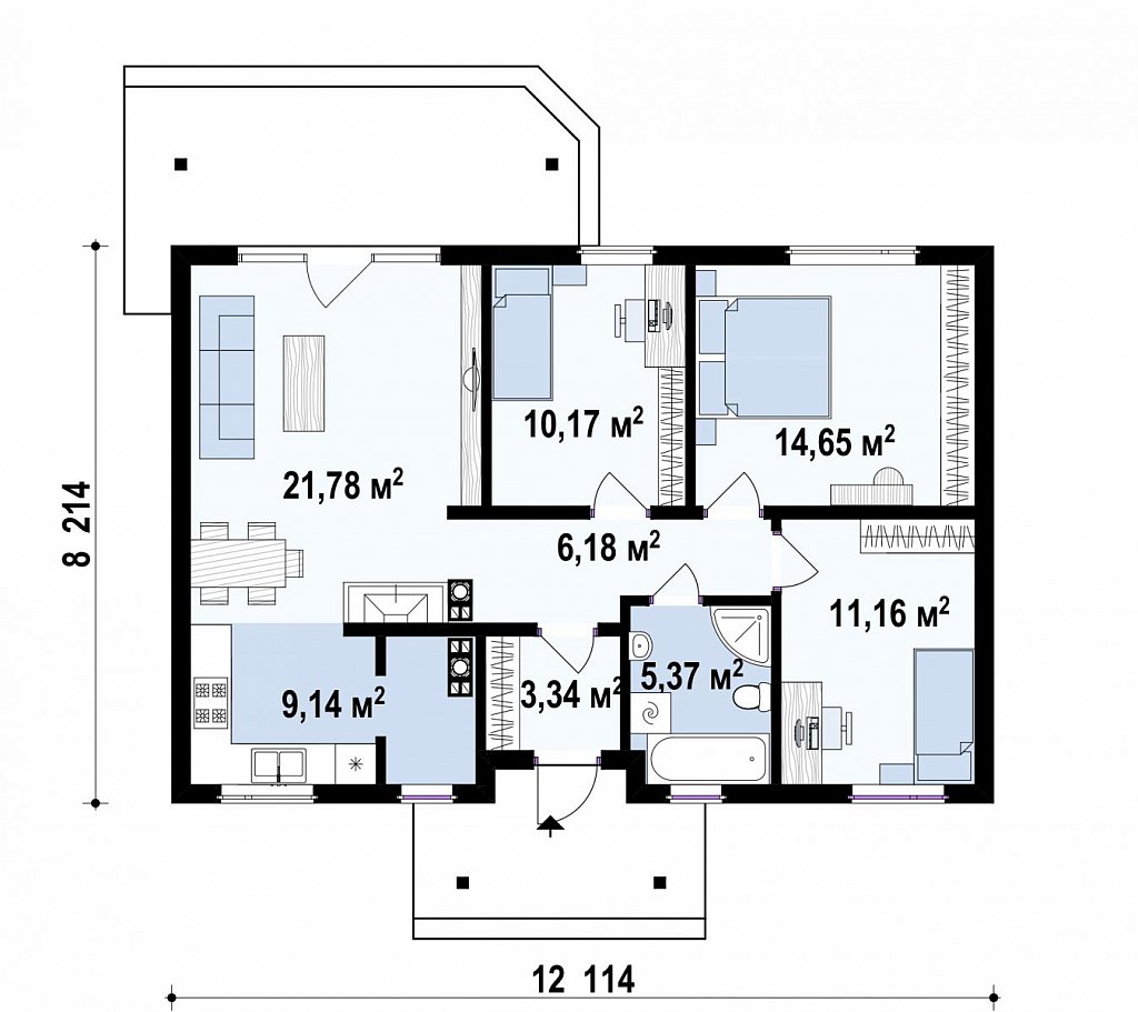 Проект одноэтажного четырехкомнатного каркасного жилого дома 8,2 м х 12,1 м в современном стиле общей площадью 87 кв.м с террасой, с тремя спальнями, с одним санузлом, с камином.