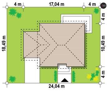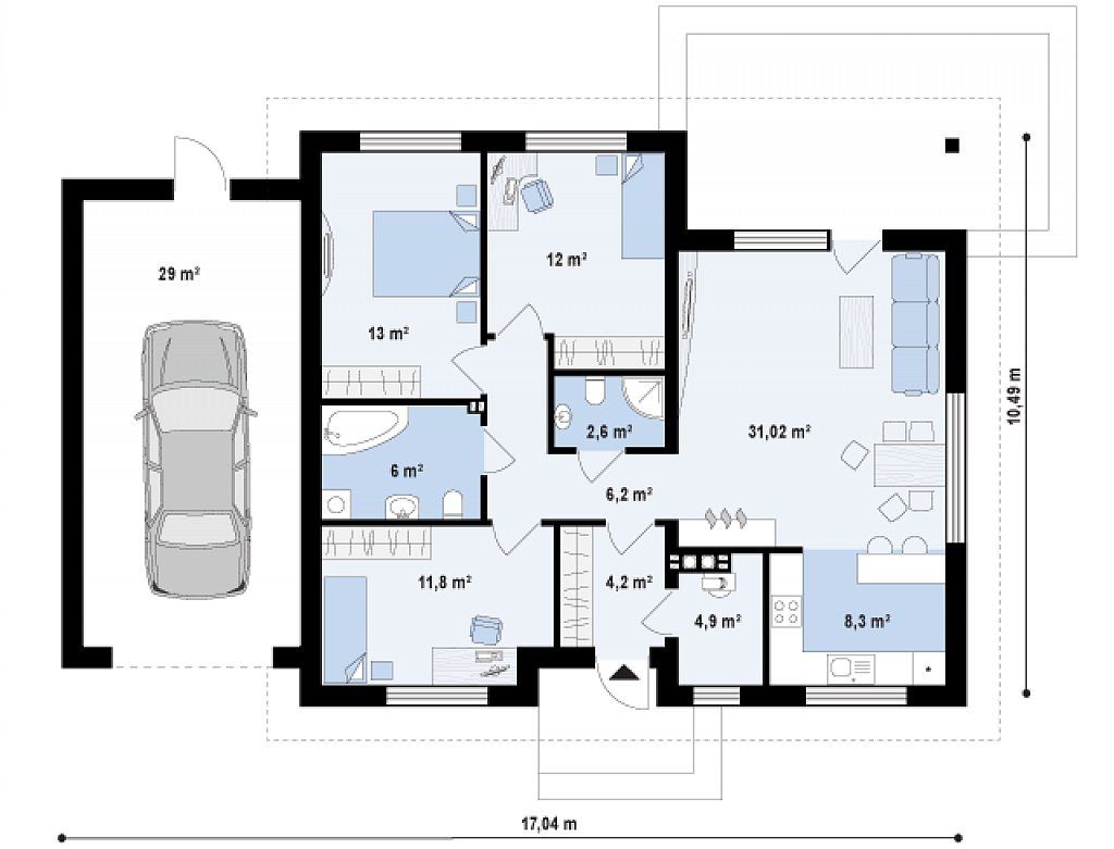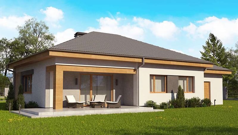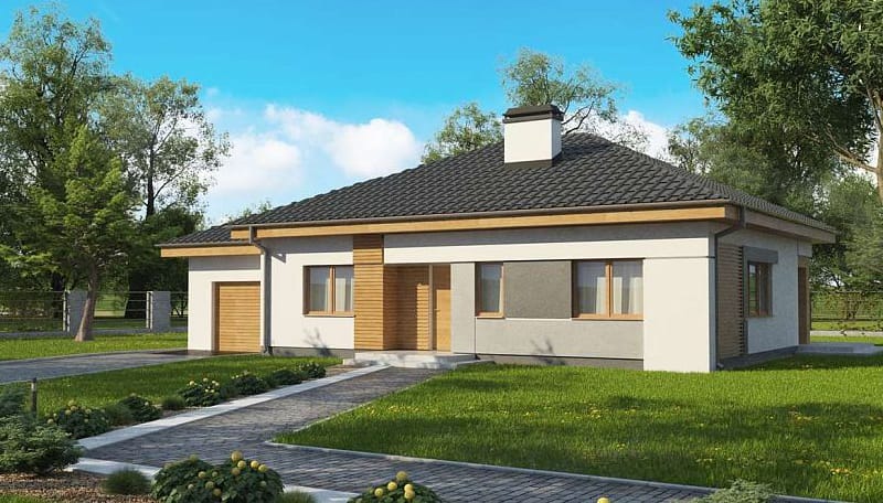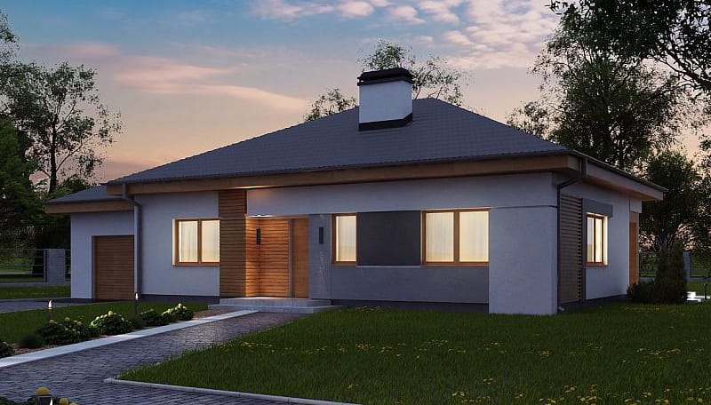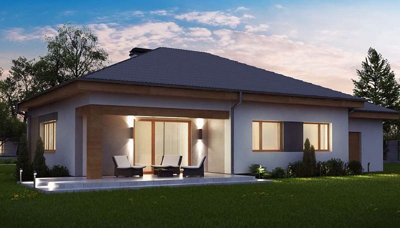 Проект одноэтажного четырехкомнатного каркасного жилого дома 10,49 м х 17,04 м в современном стиле общей площадью 129 кв.м с гаражом для одного автомобиля, с террасой, с тремя спальнями, с двумя санузлами, с камином.