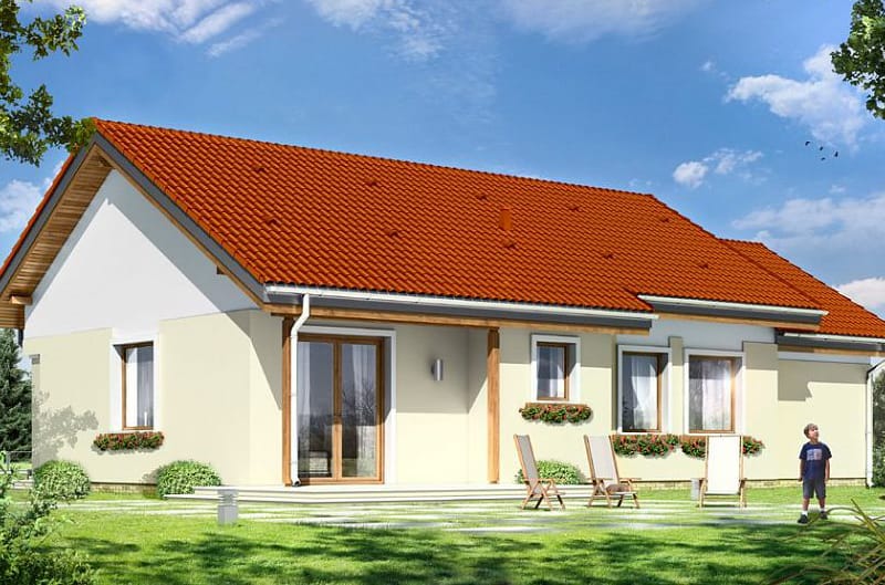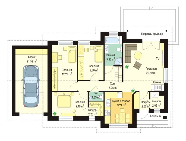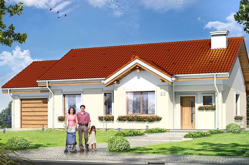 Проект одноэтажного четырехкомнатного каркасного жилого дома 9,83 м х 16,02 м в классическом стиле общей площадью 131 кв.м с гаражом для одного автомобиля, с террасой, с тремя спальнями, с двумя санузлами, с камином.